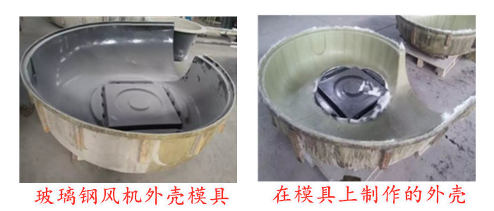 上圖是完整的玻璃鋼風機外殼,其主要有兩部分組成,即外殼的兩部分分別進行制作,完成之后將兩者組合在一起。